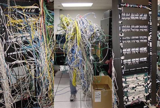 This mini-project was part of fixing up a remote Data Center to become "lights-out" i.e. no local IT staff. If you ever had to re-do cabling, you can appreciate these "Before, During, and After pictures. Once completed, all open ports were locked down thus requiring local desktop support to engage Corporate IT for all moves, adds, and changes.